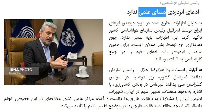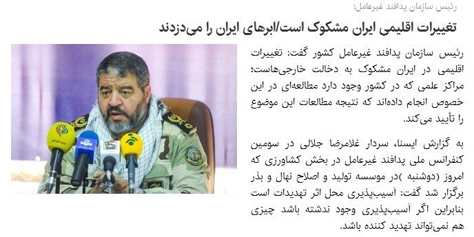 وی با بیان اینکه ادعای ایران درباره‌ی دستکاری اقلیمی، برای ما که جنگ اقلیمی را پیگیری می‌کنیم تعجبی ندارد، تأکید کرد: چنین احتمالی وجود دارد.