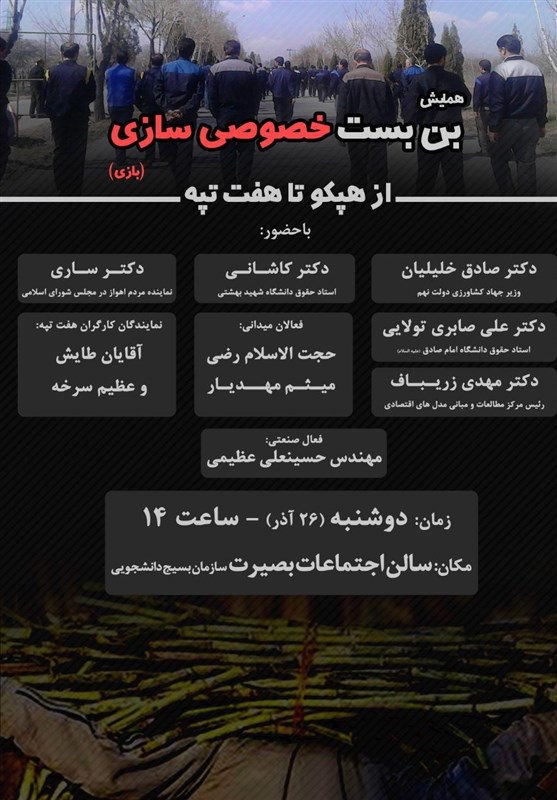 این همایش با حضور صادق خلیلیان، وزیر جهاد کشاورزی دولت نهم، کاشانی، استاد حقوق دانشگاه شهید بهشتی، ساری، نماینده مردم اهواز در مجلس، علی صابری تولایی، استاد حقوق دانشگاه امام صادق، ضریبافان، رئیس مرکز مطالعات و مبانی مدل‌های اقتصادی، فعالان اقتصادی و نمایندگان کارگران هفت تپه و ... برگزار خواهد شد.