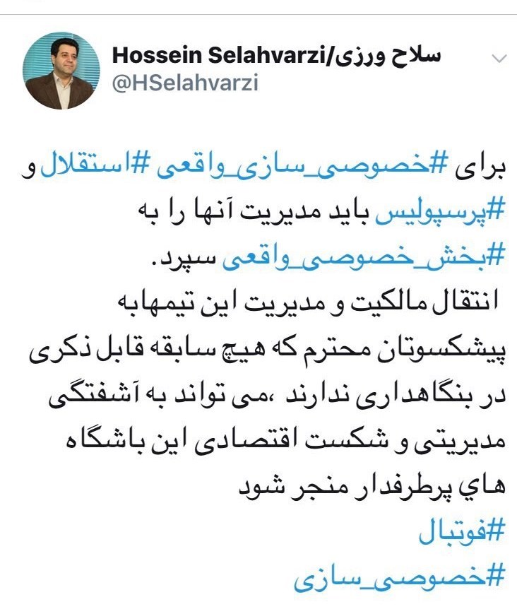 به گزارش خبرنگار اقتصادی خبرگزاری تسنیم ، حسین سلاح ورزی نایب رئیس اتاق بازرگانی ایران با ارسال پیامی در فضای مجازی درباره واگذاری تیمهای فوتبال استقلال و پرسپولیس تهران نوشت: برای خصوصی سازی واقعی استقلال و پرسپولیس باید مدیریت آنها را به بخش خصوصی واقعی سپرد.