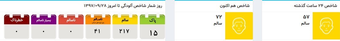 شاخص کیفیت هوا در ساعت 8مورخ 1397/09/28 و مقایسه آن با روز گذشته را در نمودار زیر مشاهده می کنید؛ حد سلامت نمودار شامل اطلاعات تایید شده مربوط به کل ایستگاه های شهر تهران است.