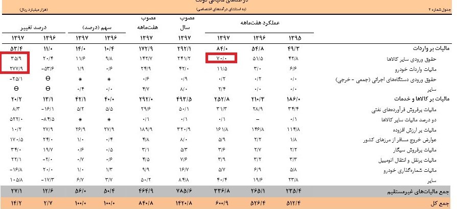 همچنین در این مدت 1100 میلیارد تومان مالیات حقوق ورودی خودرو وصول شده که نسبت به مدت مشابه سال قبل 277 درصد رشد داشته است. رشد شدید حقوق ورودی خودرو به ممنوعیت واردات این کالا در سال گذشته نیز ارتباط دارد. حقوق ورودی سایر کالاها نیز 3600میلیارد تومان بوده که نسبت به مدت مشابه سال قبل رشد 36 درصدی را تجربه کرده است.