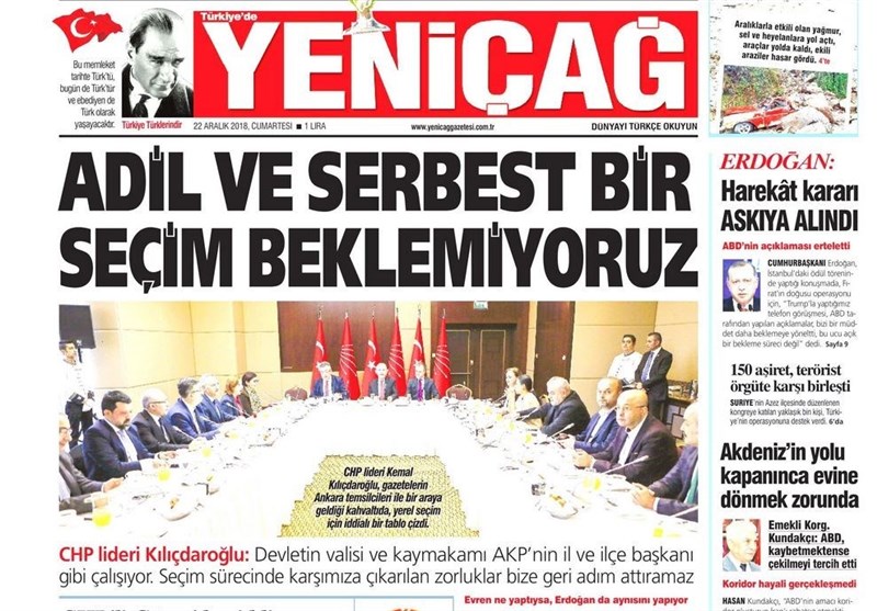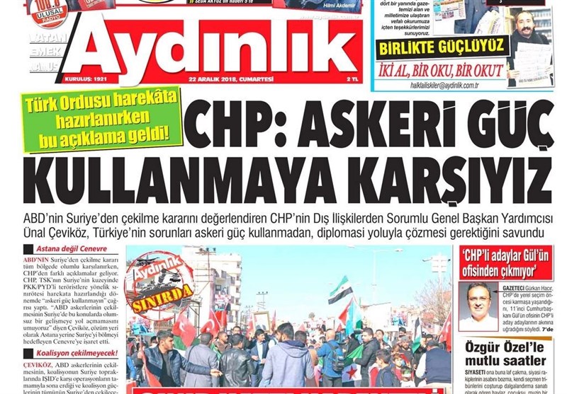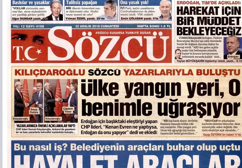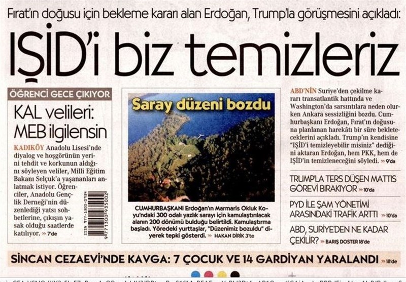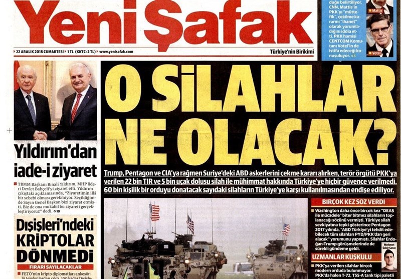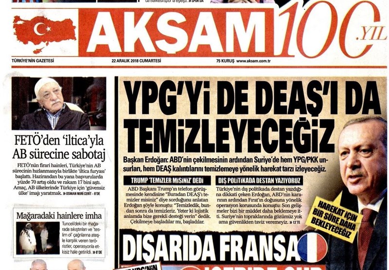 به گزارش گروه بینالملل خبرگزاری تسنیم ، بسیاری از روزنامههای ترکیه، امروز در عکس و تیتر صفحه نخست، تصمیم ترامپ برای خروج از سوریه و استعفای ماتیس را برجسته کردهاند. همچنین این روزنامهها موضوعات دیگری مانند سخنان اردوغان و دیدار باغچلی و یلدرم را مورد توجه قرار دادند.