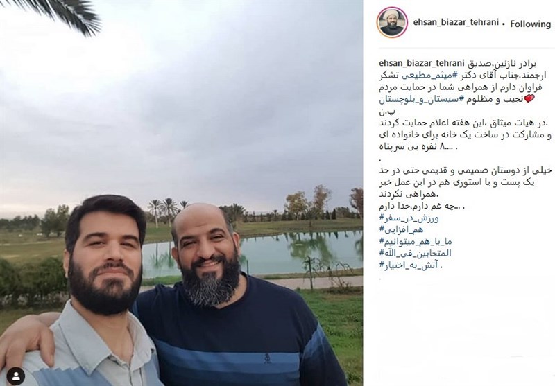 در ادامه این تصویر آمده است: «برادر نازنین، صدیق ارجمند، جناب آقای دکتر میثم‌مطیعی؛ تشکر فراوان دارم از همراهی شما در حمایت مردم نجیب و مظلوم سیستان‌و بلوچستان