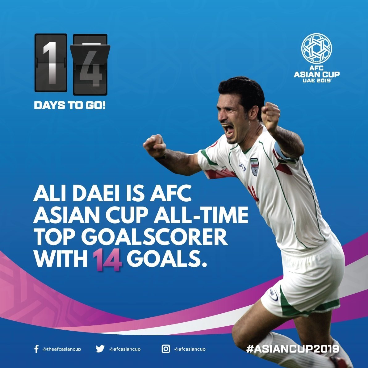در حالی که 14 روز تا آغاز مسابقات جام ملتهای آسیا باقی مانده، حساب رسمی بازیها به گلهای زده علی دایی در ادوار مسابقات اشاره کرد و نوشت: علی دایی با 14 گل زده، آقای گل تاریخ رقابتهای جام ملتهای آسیاست.