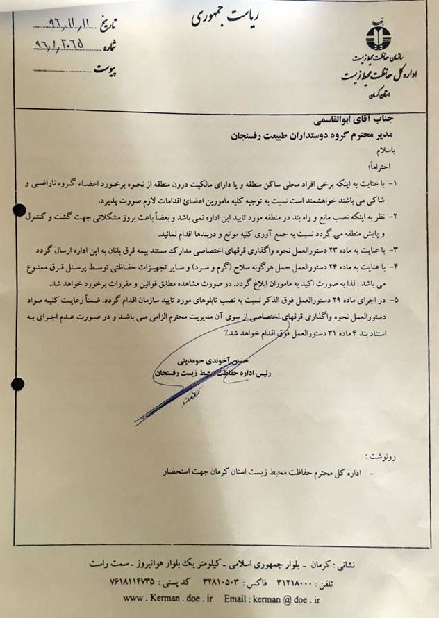 وی همچنین یادآور میشود: مجوز قرق منصورآباد به یک NGO محیط زیستی به نام دوستداران طبیعت رفسنجان واگذار شده که اغلب اعضای آن شکارچیانی هستند که طبق گفته خودشان تصمیم گرفته بودند شکار را کنار بگذارند اما حالا بسیاری از اعضای سابق از جمله اعضای هیئت مدیره آن طی مکاتباتی با استانداری و فرمانداری، خواهان رسیدگی به وضعیت نابسامان قرق خصوصی منصورآباد شدهاند.