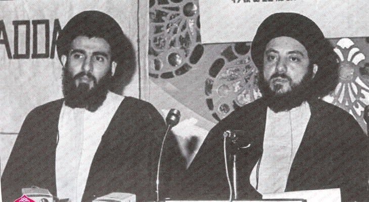 مرحوم شهید حکیم و آیتالله هاشمی شاهرودی در کنفرانس "جنایات صدام" در دهه شصت