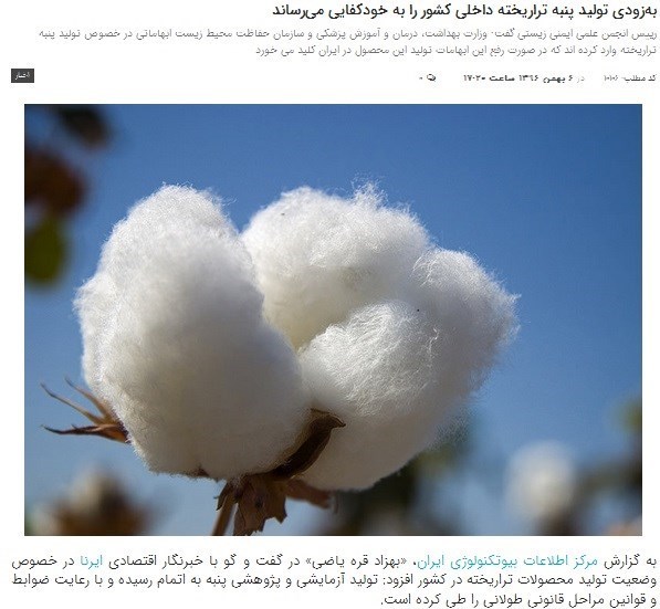 - «پنبهی تراریخت عملکرد بالاتری دارد و برای کشاورز و کشور منفعت در پی دارد.» و