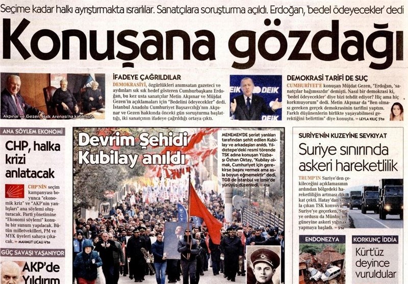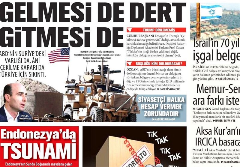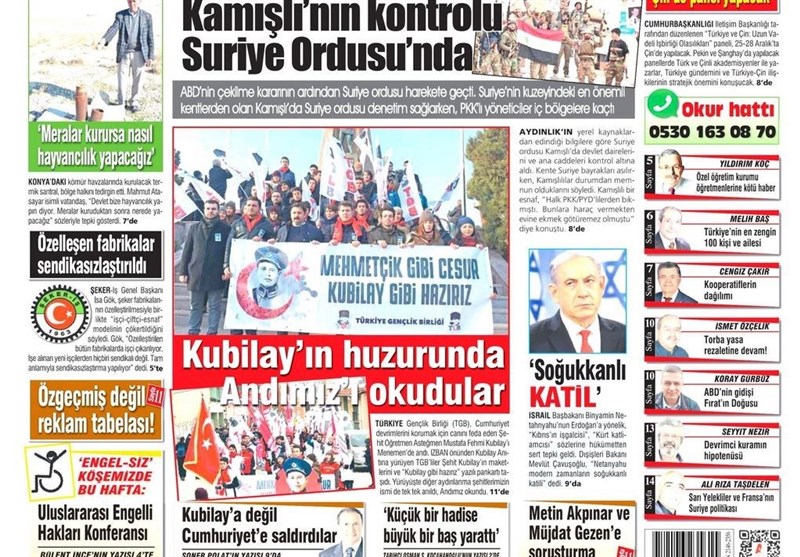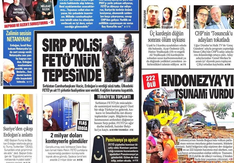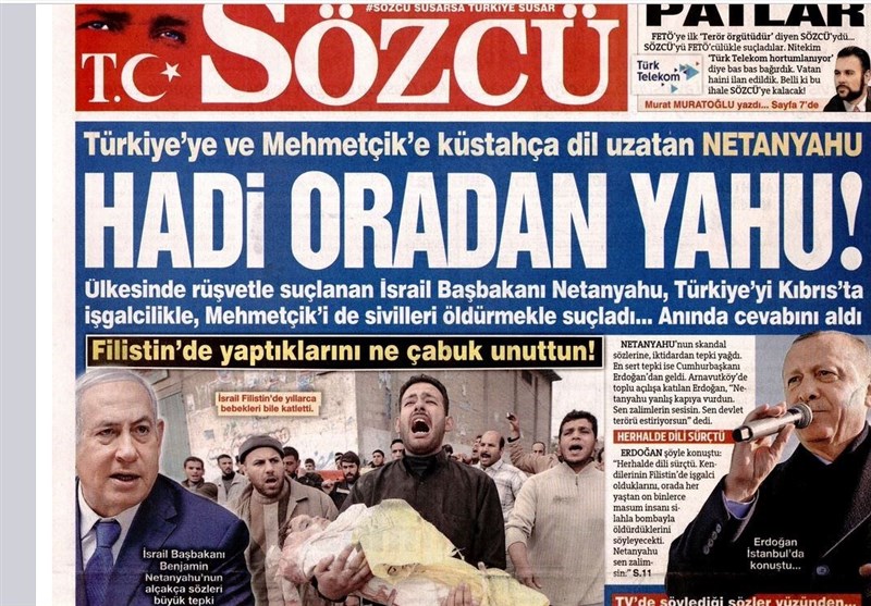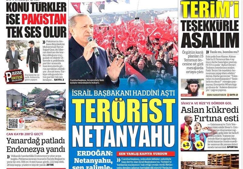 به گزارش گروه بینالملل خبرگزاری تسنیم ، بسیاری از روزنامههای ترکیه، امروز در عکس و تیتر صفحه نخست، سخنان اردوغان در مورد نخست وزیر رژیم صهیونیستی را برجسته کردهاند. همچنین این روزنامهها موضوعات دیگری مانند موضوع خروج نظامیان آمریکایی از سوریه را مورد توجه قرار دادهاند.