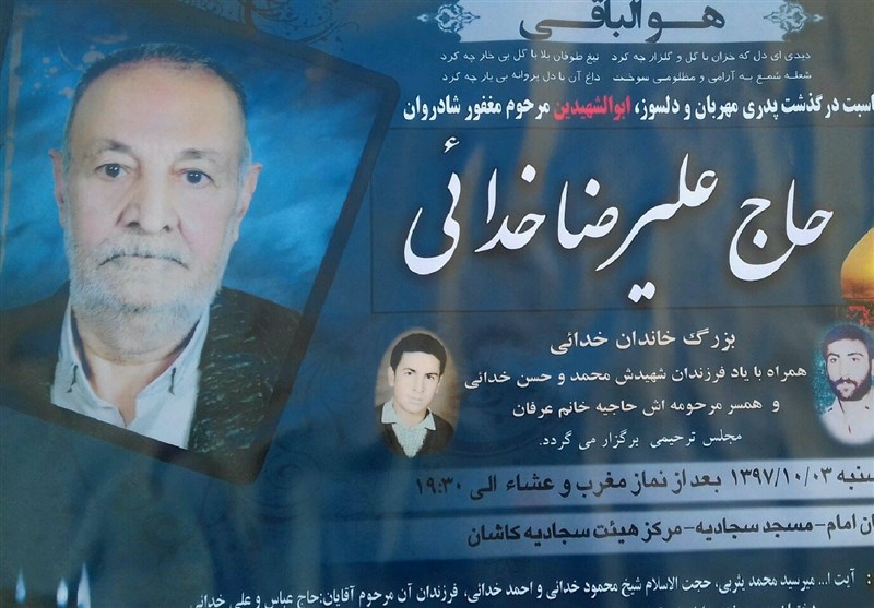به گزارش خبرگزاری تسنیم از کاشان، حاج علیرضا خدایی پدر معظم شهیدان محمد و حسن خدایی به علت بیماری و کهولت سن در سن 88 سالگی به رحمت خدا پیوست.