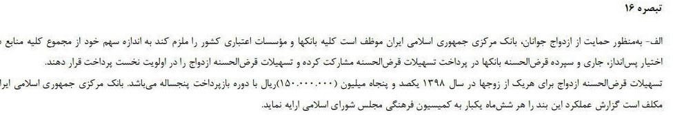به گزارش خبرنگار اقتصادی خبرگزاری تسنیم ، بر اساس تبصره 16 لایحه بودجه 95 به منظور حمایت از ازدواج جوانان  بانک مرکزی جمهوری اسلامی  موظف است کلیه بانکها  و موسسات اعتباری کشور را ملزم کند به اندازه سهمخود از مجموع کلیه منابع اختیار پس انداز، جاری  و سپرده قرض الحسنه بانکها در پرداخت تسهیلات قرض الحسنه مشارکت کرده و تسهیلات قرض الحسنه ازدواج را در اولویت قرار دهند. تسهیلات قرض الحسنه ازدواج برای هر یک از زوجها در سال 98 15 میلیون تومان و با دوره بازپرداخت 5 سال میباشد.