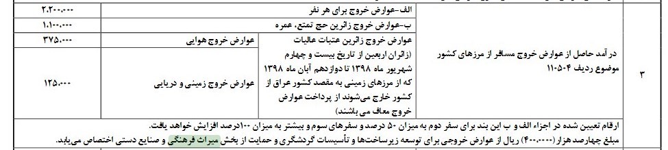 دولت برای سال 98 هزینه عوارض خروج از کشور برای هر نفر و همچنین به تفکیک خروج هوایی و مرزهای زمینی برای زائران عتبات عالیات و حج تمتع و عمره را تقدیم مجلس کرد. همچنین ارقام خروج از کشور برای سفر دوم 50 درصد و سفر سوم به میزان 100 درصد افزایش می‌یابد.