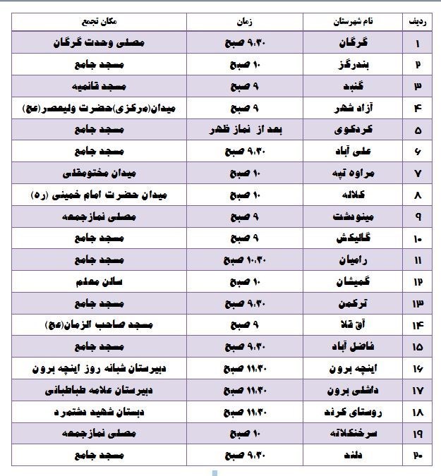 به گزارش خبرگزاری تسنیم از گرگان، شورای هماهنگی تبلیغات اسلامی استان گلستان در اطلاعیهای محل تجمع و راهپیمائی یوم الله 9 دی در شهرها و مناطق مختلف استان گلستان را اعلام کرد.