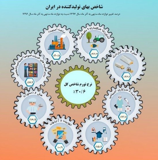 شاخص بهای تولیدکننده در ایران در دوازده ماه منتهی به آذر ماه 1397 نسبت به دوازده ماه منتهی به آذر ماه 1396 بهمیزان 30.6 درصد افزایش یافته است.
