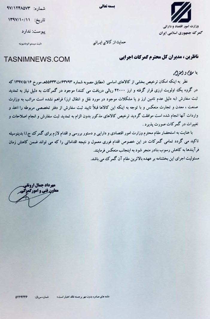 با عنایت به استحضار مقام محترم وزارت امور اقتصادی و دارایی و دستور بررسی و اقدام لازم برای گمرک جمهوری اسلامی ایران بدینوسیله تأکید میگردد تمامی گمرکات در این خصوص اقدام فوری معمول و نتیجه اقداماتی را که میتواند ضمن کاهش زمان فرآیندها به کاهش رسوب بنادر منجر شود به اینجانب منعکس فرمایند.