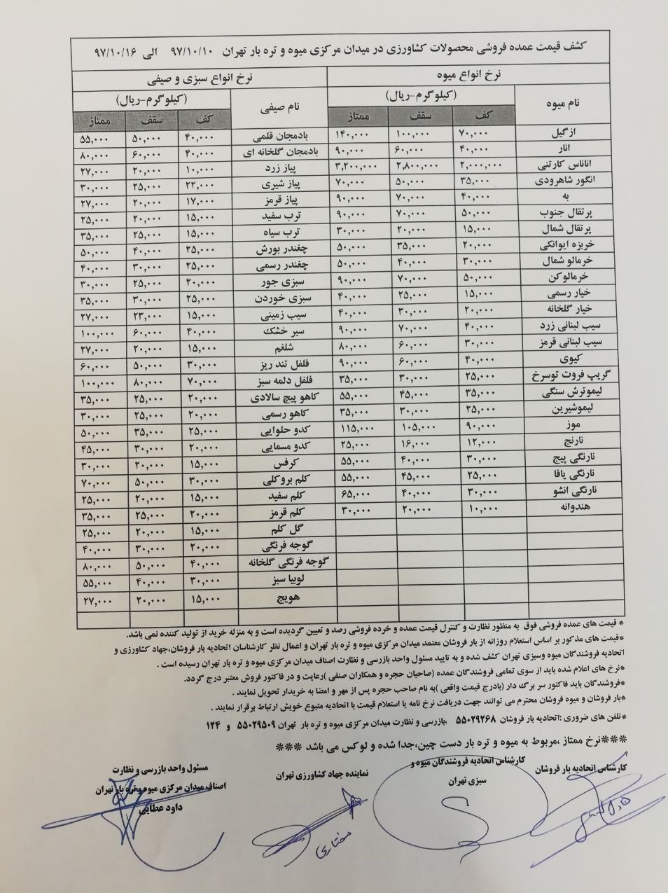 به گزارش خبرنگار اقتصادی خبرگزاری تسنیم، قیمت عمده فروشی انواع میوه انواع میوه در میدان مرکزی میوه و تره بار شهرداری تهران اعلام شد، این نرخ پایه قیمتی برای خرده فروشی در سطح شهر است. بنابراعلام اتحادیه فروشندگان میوه و سبزی تهران، فروشندگان سطح شهر اجازه افزایش قیمت تا 35 درصد این نرخ ها را دارند.