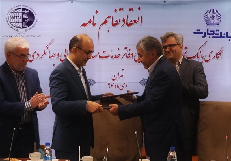 مراسم انعقاد تفاهمنامه همکاری بانک تجارت و انجمن صنفی دفاتر خدمات مسافرت هوایی و جهانگردی ایران، ظهر چهارشنبه دوازدهم دیماه با حضور رضا دولتآبادی مدیرعامل بانک تجارت، علیرضا حاجعلی رییس هیئتمدیره بانک تجارت، ولی الله تیموری معاون گردشگری سازمان میراثفرهنگی، صنایع دستی و گردشگری، حرمت الله رفیعی رییس انجمن دفاتر خدمات مسافرت هوایی و جهانگردی، مرتضی دهقان معاون هوانوردی و امور بین الملل سازمان هواپیمایی کشوری و جمعی از مسئولین در ساختمان مرکزی بانک تجارت برگزار شد.