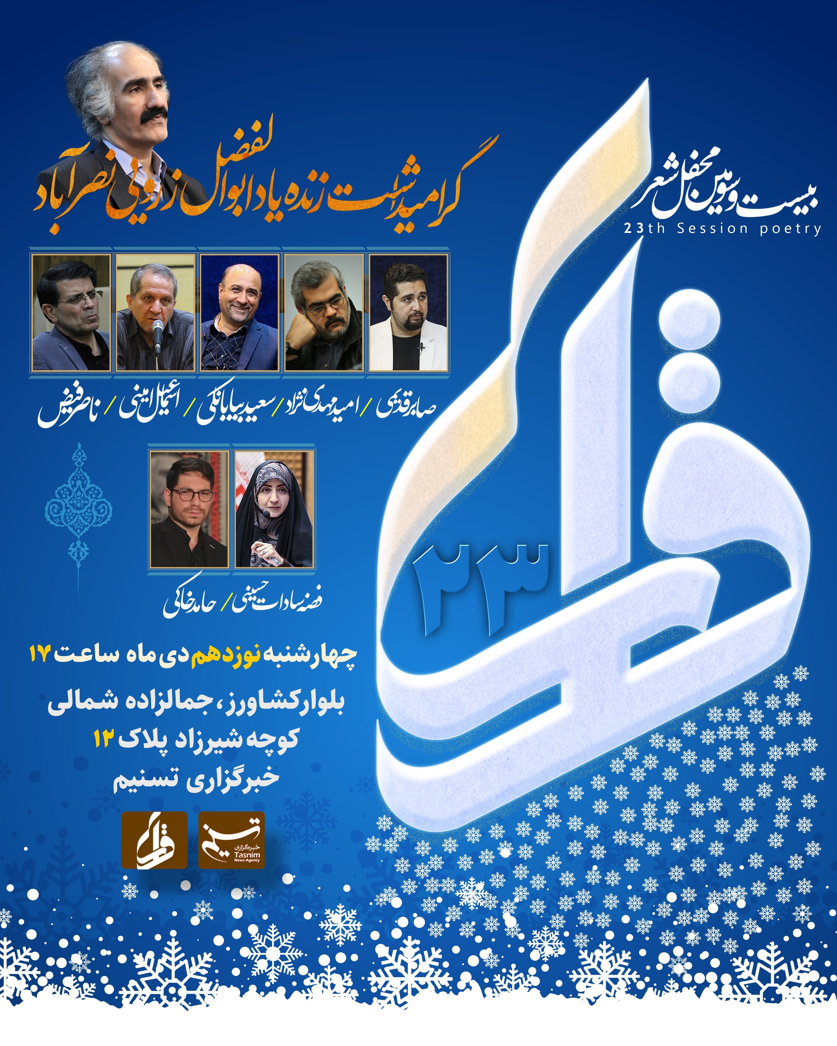 به گزارش خبرنگار فرهنگی باشگاه خبرنگاران پویا، بیست و سومین محفل شعر قرار با موضوع گرامیداشت یاد و خاطر شاعر فقید مرحوم ابوالفضل زرویی نصرآباد روز چهارشنبه 19 دی ماه در خبرگزاری تسنیم برگزار میشود.