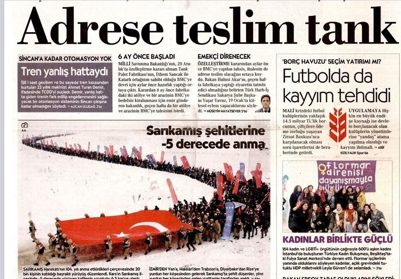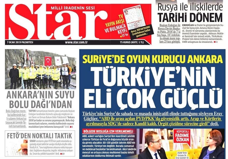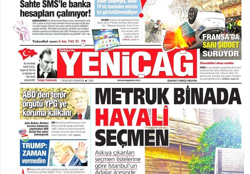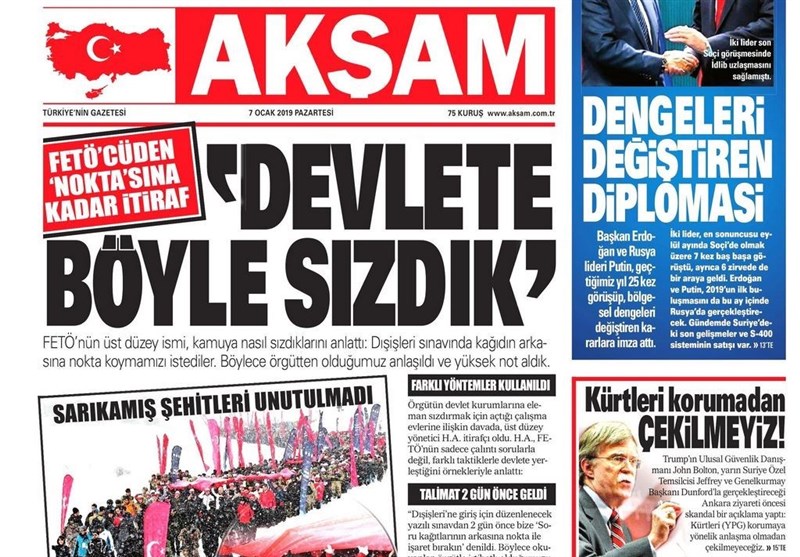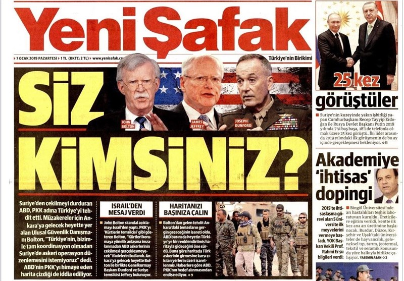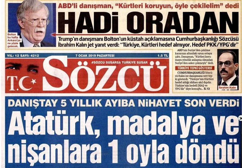 به گزارش گروه بین‌الملل خبرگزاری تسنیم، بسیاری از روزنامه‌های ترکیه، امروز در عکس و تیتر صفحه نخست، سخنان جان بولتون در مورد ضرورت حمایت آمریکا از کردهای سوریه را برجسته کرده‌اند. همچنین این روزنامه‌ها موضوعات دیگری مانند سالگرد رویداد ساری کامیش را مورد توجه قرار دادند.