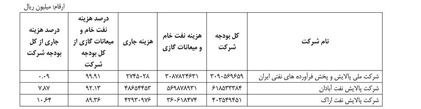 بودجه شرکتهای ملی پالایش و پخش فرآوردههای نفتی، شرکت پالایش نفت آبادان و اراک عمدتاً شامل ارزش نفتخام و میعانات گازی است که به شرح زیر جدول زیر میباشد: