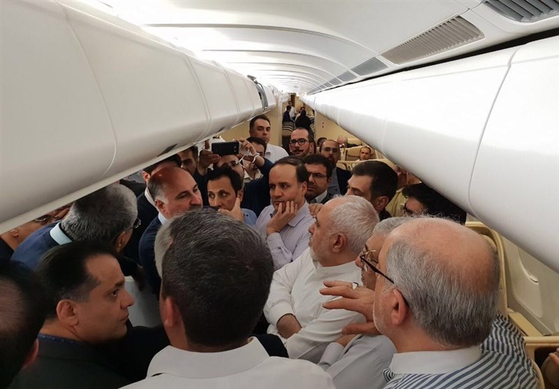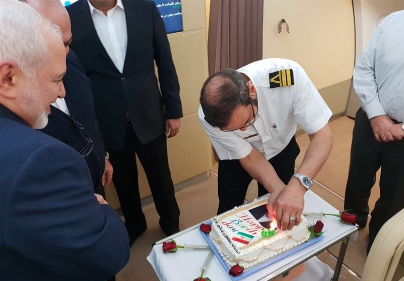 دکتر ظریف پس از فوت کردن شمع های روی کیک، با مسافران هواپیما و خبرنگاران به گپ و گفت دوستانه پرداخت.