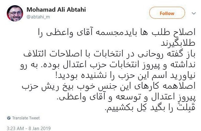 به گزارش خبرنگار حوزه احزاب خبرگزاری تسنیم، محمدعلی ابطحی رئیس دفتر رئیس دولت اصلاحات در واکنش به مصاحبه امروز محمود واعظی رئیس دفتر روحانی با تسنیم که گفته "ما هیچ‌گاه با اصلاح‌طلبان تندرو ائتلاف نکردیم" در توئیتی نوشت: اصلاح طلب‌ها باید مجسمه آقای واعظی را طلا بگیرند. باز گفته روحانی در انتخابات با اصلاحات ائتلاف نداشته و پیروز انتخابات حزب اعتدال بوده.