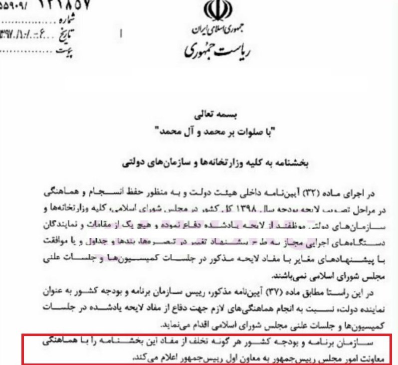به گزارش خبرنگار اقتصادی خبرگزاری تسنیم، با بخشنامه معاون اول رئیس جمهور همه وزارتخانهها و سازمانهای دولتی موظف به دفاع از لایحه بودجه98 در مجلس شورای اسلامی شده و رییس سازمان برنامهوبودجه به عنوان نماینده دولت مسؤول هماهنگی برای دفاع از مفاد لایحه در کمیسیونها و جلسات علنی مجلس شد. همچنین سازمان برنامه و بودجه، هرگونه تخلف در این خصوص را با هماهنگی معاون امور مجلس رئیس جمهور، به معاون اول رییس جمهور اعلام خواهد کرد.