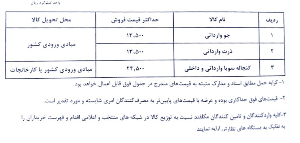 بر این اساس سقف قیمت هر کیلوگرم جو وارداتی 1350 تومان، قیمت هر کیلوگرم ذرت وارداتی 1350 تومان و نرخ هر کیلوگرم کنجاله سویای وارداتی و داخلی 2450 تومان اعلام شد این درحالی است که پیشتر قیمت هر کیلوگرم ذرت 1200 تومان و کنجاله سویا 2300 تومان بود.