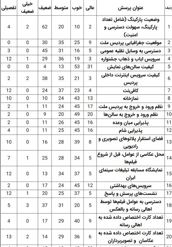 جزئیات این نظرسنجی و آرای افراد درباره پردیس ملت و کیفیت برگزاری جشنواره در جدول زیر آمده است:
