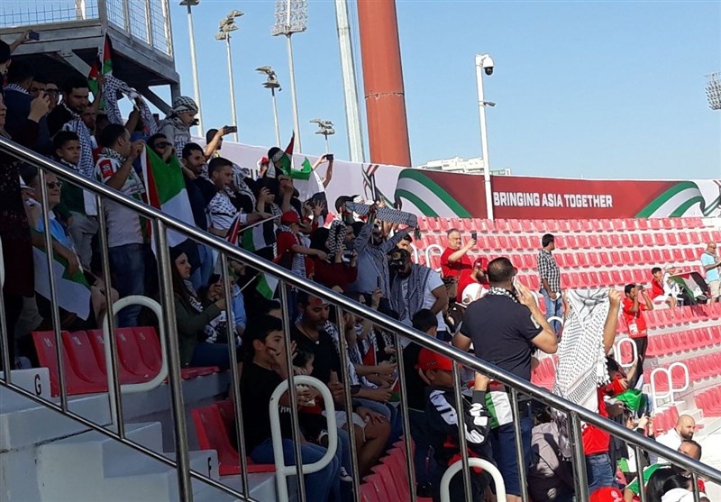 * با ورود عوامل برگزاری مراسم ابتدایی مسابقه که پرچمهای دو تیم، پرچم مسابقات و نماد پیراهنهای دو تیم را به زمین میآورند تا مراسم سرود دو کشور برگزار شود، هواداران فلسطینی چفیههای سفید رنگ مخصوصی را نشان دادند.