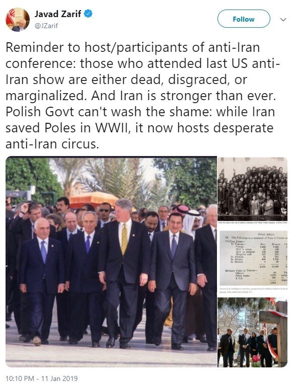 وزیر خارجه ایران در ادامه نوشت: «دولت لهستان نمی تواند این شرمندگی را پاک کند: در حالی که ایران لهستانی ها را در جنگ جهانی دوم نجات داد، این کشور اکنون میزبان سیرک مذبوحانه ضد ایرانی شده است.»