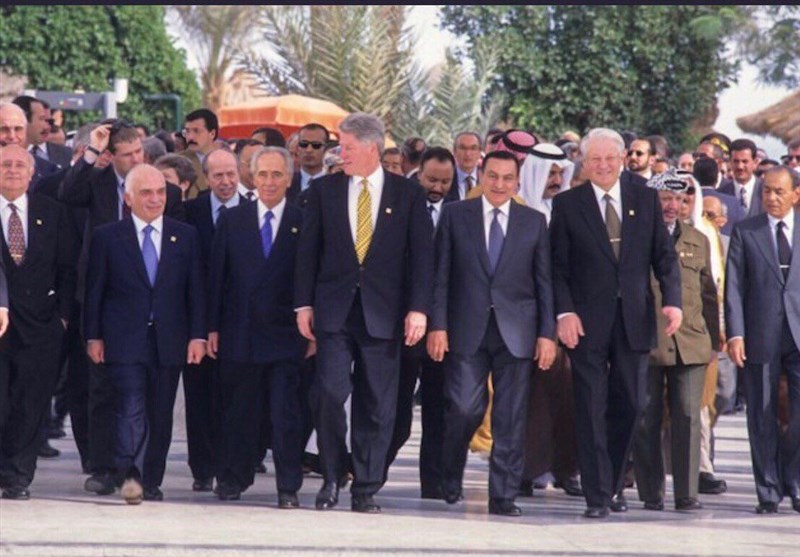 ظریف در ادامه عکس هایی از کنفرانسی را به پیام خود اضافه کرد که بیل کلینتون رئیس جمهور اسبق آمریکا را در کنار شیمون پرز رئیس معدوم رژیم صهیونیستی و حسنی مبارک رئیس جمهور ساقط شده مصر نشان می دهد.