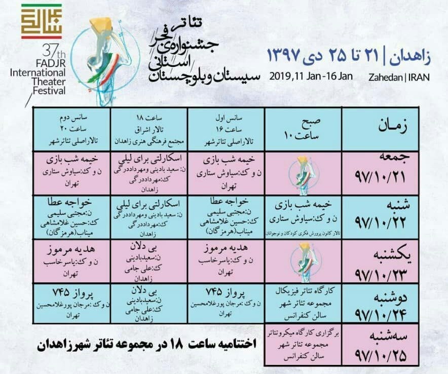 مدیرکل فرهنگ و ارشاد اسلامی استان سیستان و بلوچستان افزود: در مجموع شش نمایش منتخب هر کدام در دو سانس در این جشنواره برای مردم استان به نمایش گذاشته میشود که دو نمایش «بیدلان» اثر جامی و «اسکارلتی برای لیلی» از مهرداد درگی منتخب استان سیستان و بلوچستان هستند.
