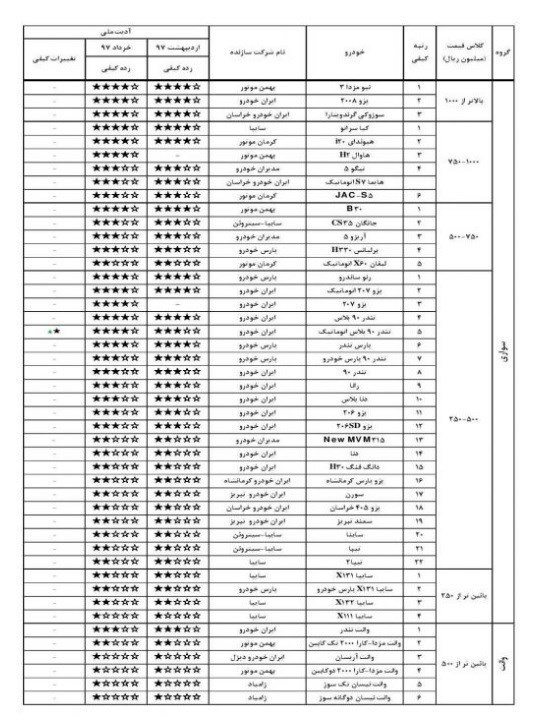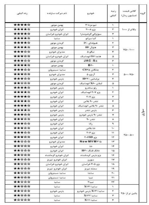 در دسته قیمتی سه b30 و چانگان cs35 و در دسته قیمتی 4 رنو ساندرو اتوماتیک ، تندر 90 پلاس اتوماتیک ، تندر 90 پلاس ، پژو 207 اتوماتیک ، پارس تندر ، پژو 207 و آریو دنده ای 4 ستاره گرفتند . در دسته قیمتی 5 هیچکدام از خودروهای ساخت داخلی نتوانستند در رده کیفی بالا قرار بگیرند و سایپا ایکس 111، سایپا ایکس 131 ، سایپا ایکس 132 و سایپا ایکس 131 پارس خودرو دو ستاره گرفتند .