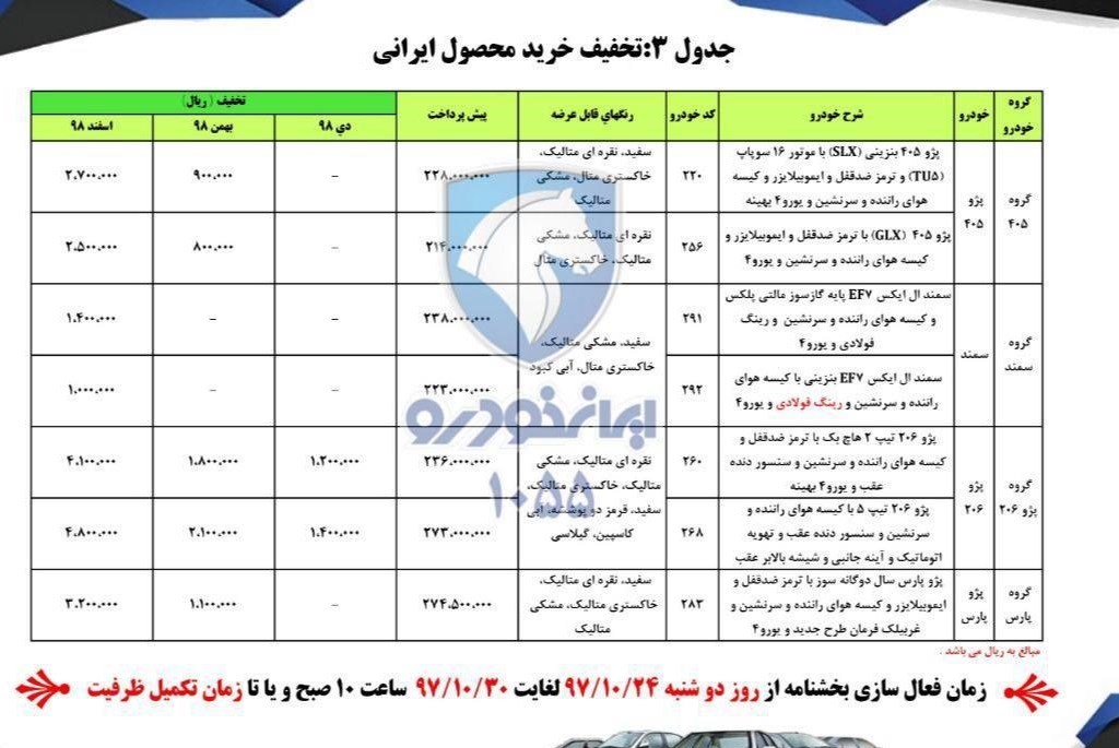 لازم به توضیح است پیش فروش دی ماه محصولات ایران خودرو از ساعت 10 صبح دوشنبه بیست و چهارم این ماه آغاز می شود و ثبت نام در این طرح صرفا از طریق سایت فروش اینترنتی شرکت ایران خودرو به نشانی esale.ikco.ir و یا مراجعه به نمایندگی های مجاز سراسر کشور امکان پذیر است.