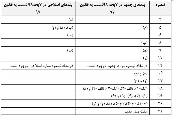 تغییرات تبصره‌ها و بندهای اصلاحی و جدید در بودجه98 در مقایسه با بودجه 97 +جدول