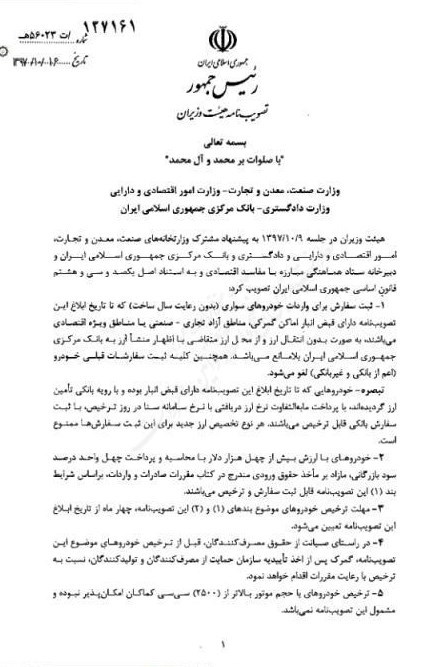 به گزارش تسنیم، تصویبنامه مصوب جلسه مورخ 9 دیماه 97 هیئت وزیران در خصوص ثبت سفارش برای واردات خودروهای سواری، طی نامه شماره 137161در تاریخ 16 دیماه 97 توسط معاون اول رئیسجمهور ابلاغ شد.