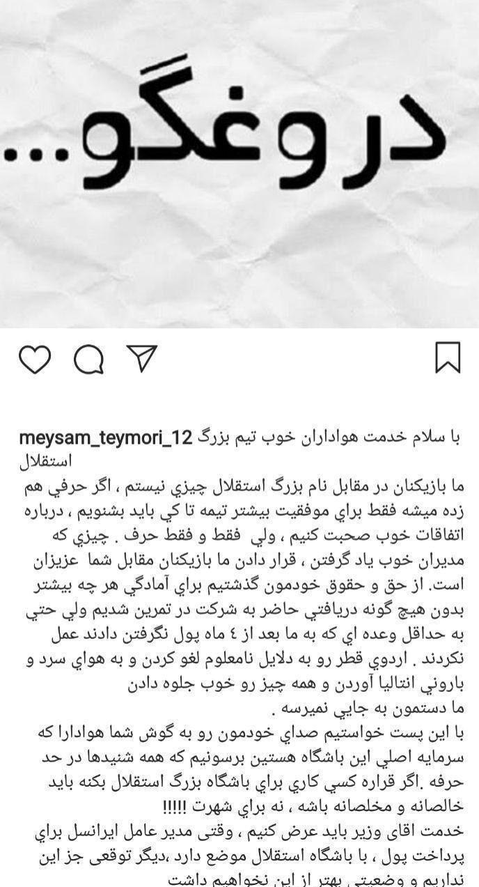 آبیپوشان در این پست به عدم دریافت حقوق در چهار ماه اخیر اشاره کردند. آنها همچنین نوشتند که اردوی قطر به خاطر مشکلات مالی لغو شد و پس از مهیا شدن اردو در کشور ترکیه با آب و هوایی سرد، همه چیز به خوبی جلوه داده شده است.