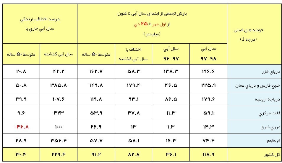 به گزارش خبرنگار اقتصادی خبرگزاری تسنیم، بر اساس آمار رسمی دفتر مطالعات پایه منابع آب شرکت مدیریت منابع آب ایران، ارتفاع کل ریزشهای جوی از اول مهر تا 25 دی سال آبی 98-97 (115 روز ابتدایی سال آبی جاری) بالغ بر 118.9 میلیمتر است.