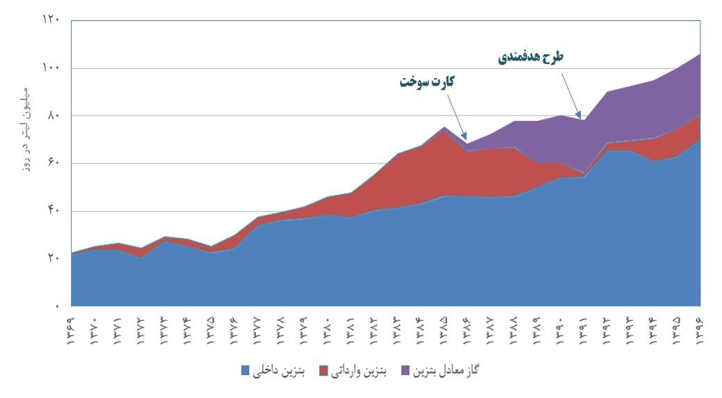 بخش بنفش نمودار که نشان دهنده سی ان جی جایگزین شده با بنزین است، حجمی معادل 63 میلیارد متر مکعب دارد که پیمایش آن تقریبا معادل 63 میلیارد لیتر است. چنانچه سی ان جی از سال 1384 وارد سبد سوخت کشور نمی شد، کشور می بایست 63 میلیارد لیتر بیشتر بنزین وارد می کرد تا تقاضا را تأمین نماید. جایگزینی بیشتر سی ان جی با بنزین نیز می تواند از افزایش مصرف بنزین جلوگیری کرده و فرصت صادرات بنزین و سایر فرآورد ها را برای کشور ایجاد نماید.