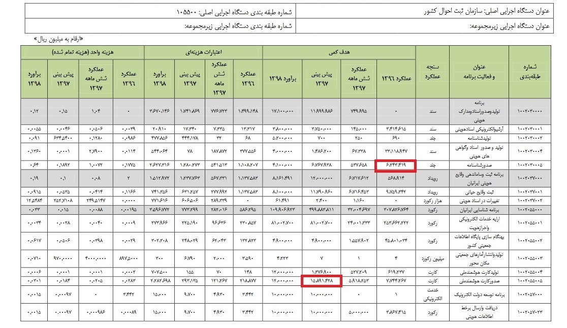 به گزارش خبرنگار اقتصادی خبرگزاری تسنیم، بررسی عملکرد بودجه نشان میدهد طی سال 96 حدود 6.2 میلیون شناسنامه صادر شده که هزینه صدور هر قطعه شناسنامه حدود 177 هزار تومان بوده است. کل بودجه لحاظ شده برای صدور شناسنامه در سال 96 حدود 110 میلیارد تومان، برای سال 97 حدود 128 میلیارد تومان و برای سال 98 حدود 262 میلیارد تومان است.