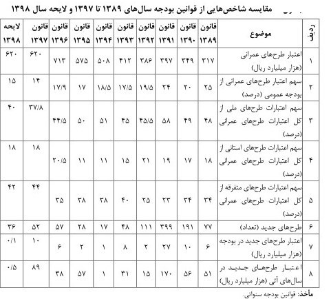 گفتنی است، در لایحه بودجه 98 سهم اعتبار طرحهای جدید در بودجه 98 حدود 0.1 درصد است. در لایحه بودجه، 36 طرح  عمرانی جدید  گنجانده شده است.