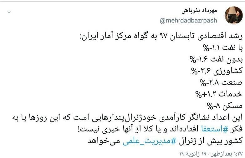 به گزارش خبرگزاری تسنیم، مهرداد بذرپاش طی مطلبی طی مطلبی در صفحه شخصی خود در توئیتر، با انتقاد از کاهش رشد اقتصادی کشور با استناد به آمار مرکز آمار ایران، نوشت: این اعداد نشان‌گر کارآمدی خود ژنرال پندارهایی است که این روزها یا به فکر استعفا افتاده‌اند و یا کلاً از آنها خبری نیست کشور بیش از ژنرال به مدیریت علمی می‌خواهد.