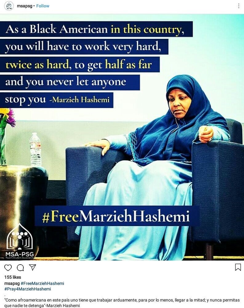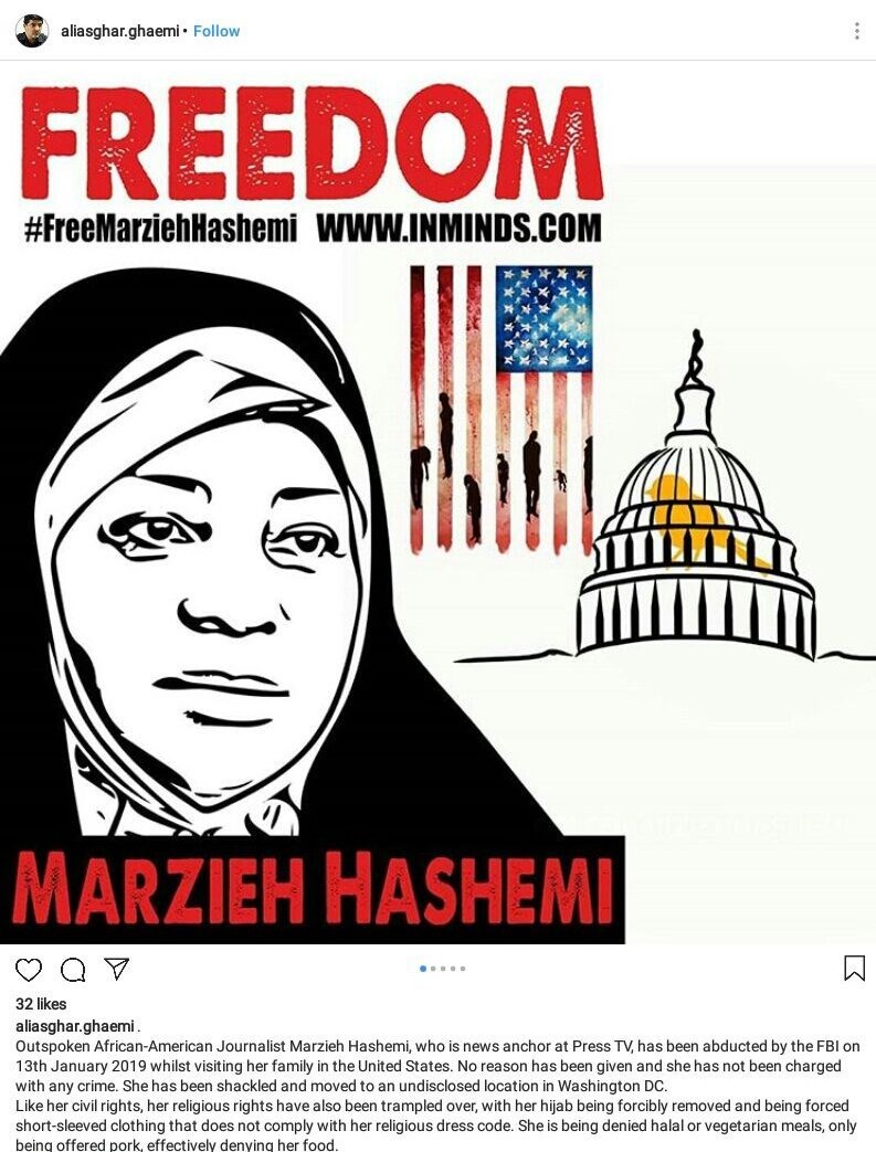 از صبح روز چهارشنبه، بسیاری از کاربران شبکه‌های اجتماعی با هشتگ‌های #مرضیه_هاشمی_را_آزاد_کنید، اقدام به تولید محتوا درباره او کرده و به رفتار غیرقانونی و وحشیانه پلیس آمریکا با این مجری آمریکایی ــ ایرانی اعتراض کرده‌اند.