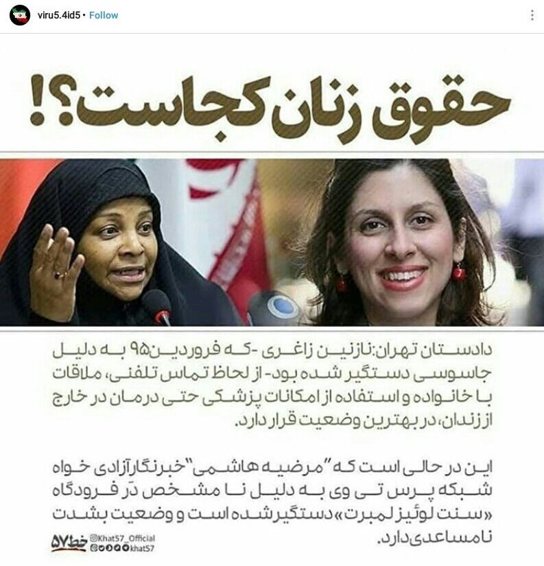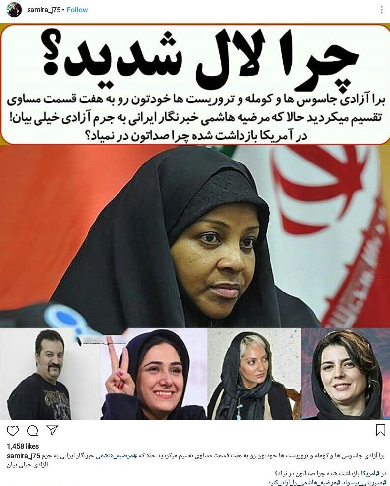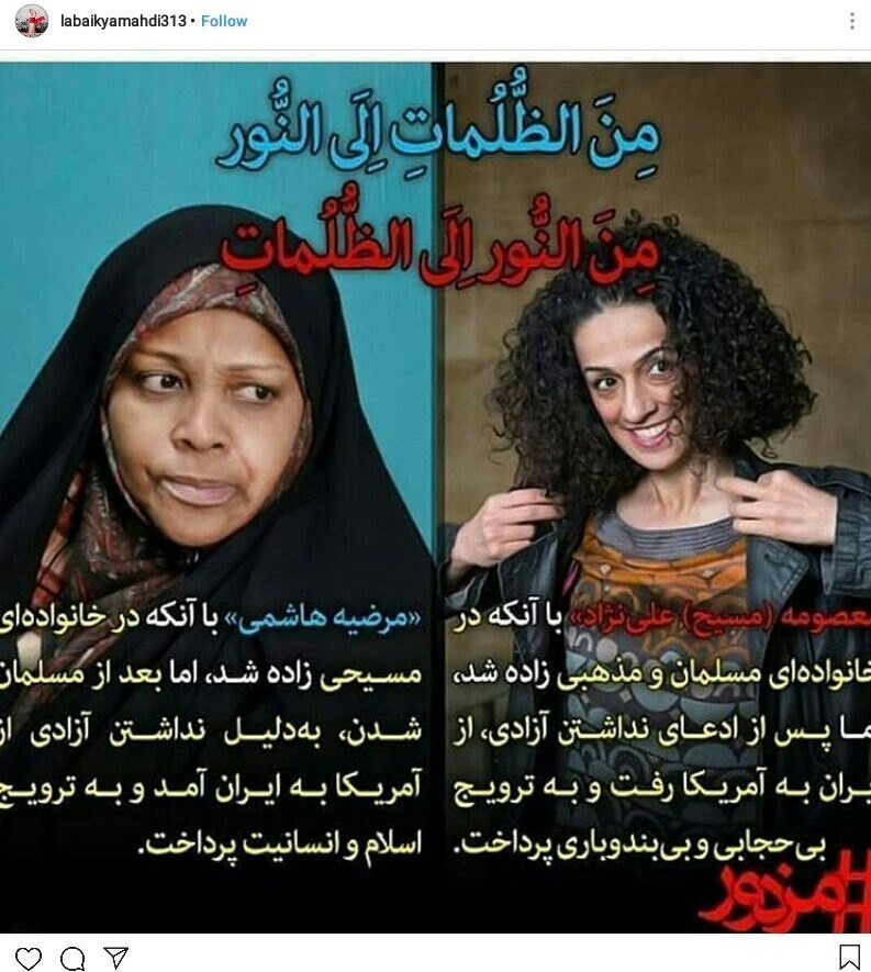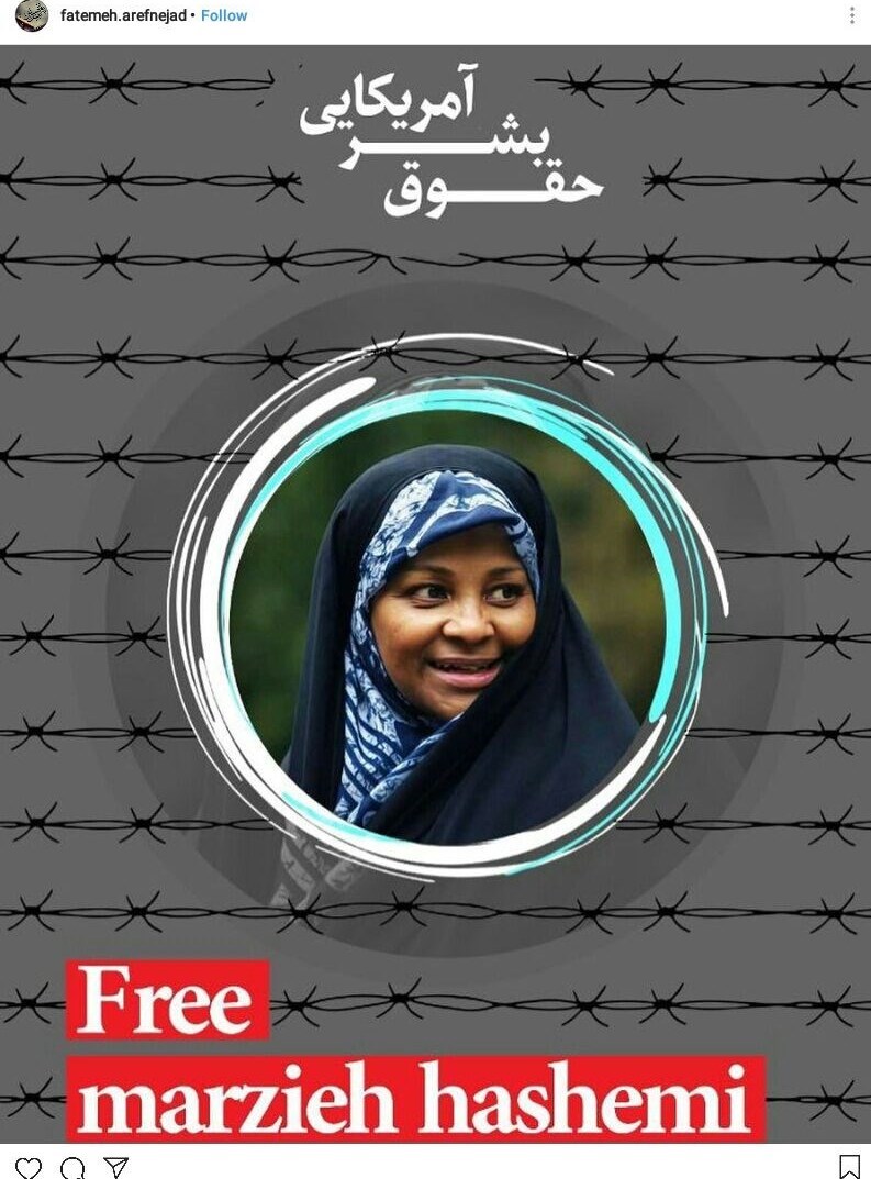 مقایسه وضعیت مرضیه هاشمی که یک آمریکایی مسلمان و محجبه در ایران است با معصومه علی نژاد که یک ایرانی کشف حجاب کرده علیه ایران است، بخش دیگری از نوع واکنش‌های کاربران فضای مجازی نسبت به موضوع بازداشت مرضیه هاشمی بود. تعدادی از پوسترهای و پست‌های مردم در شبکه‌های اجتماعی در ادامه قابل مشاهده است: