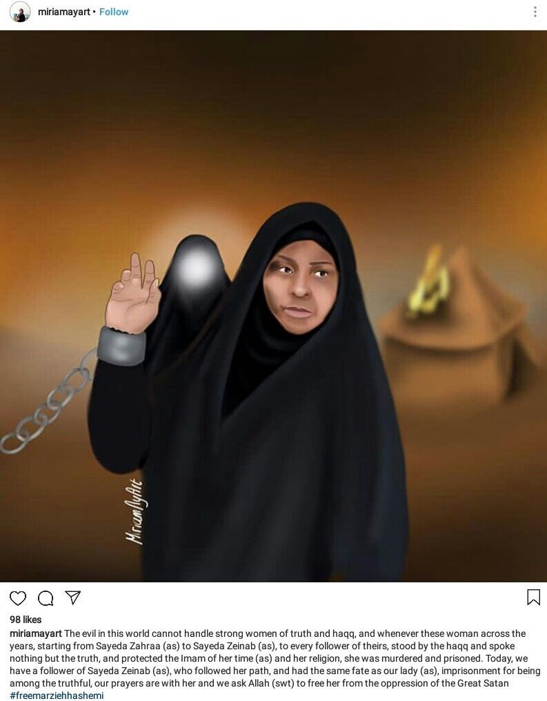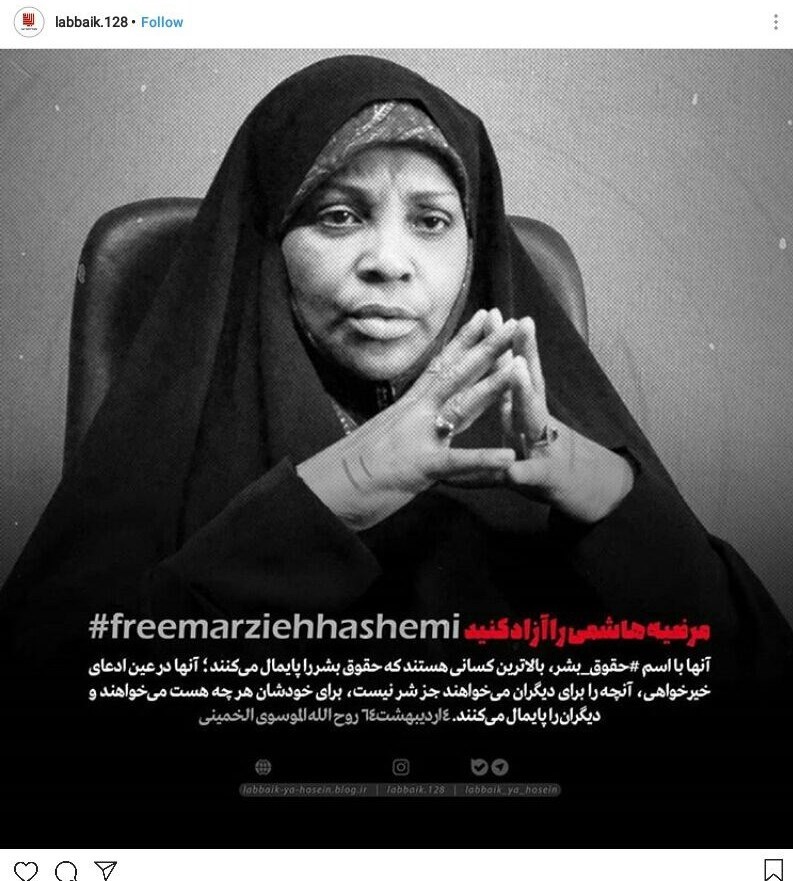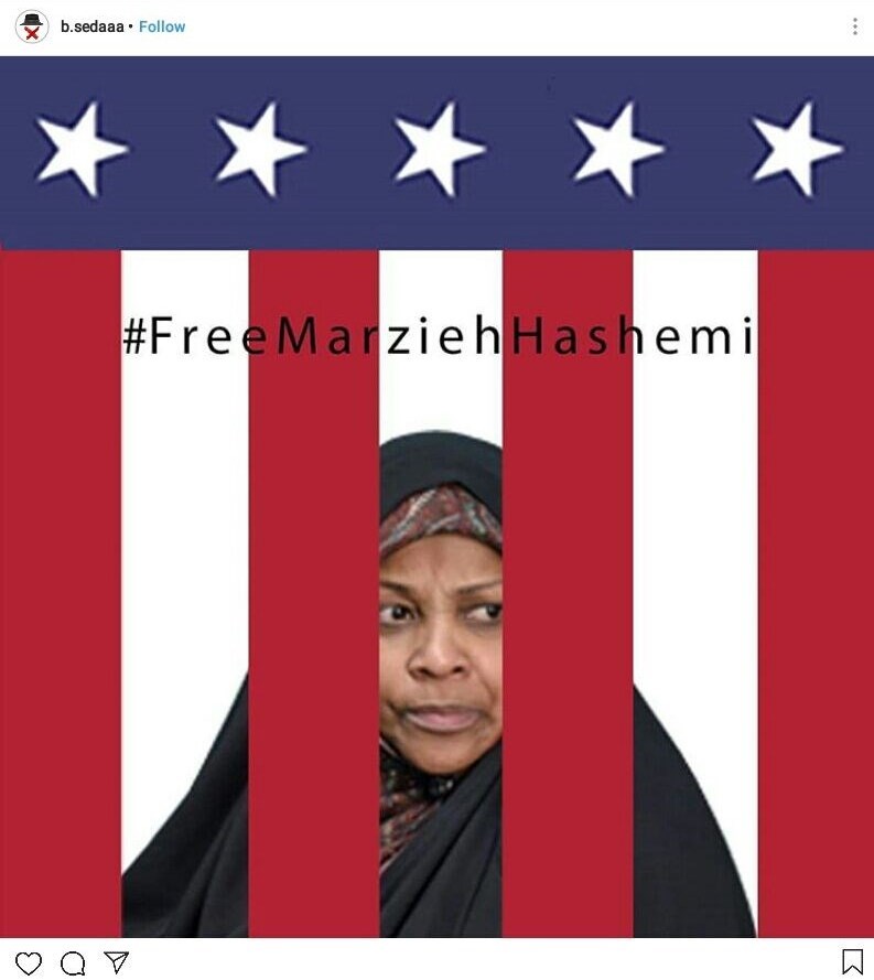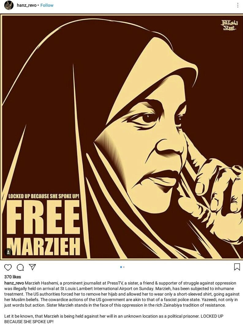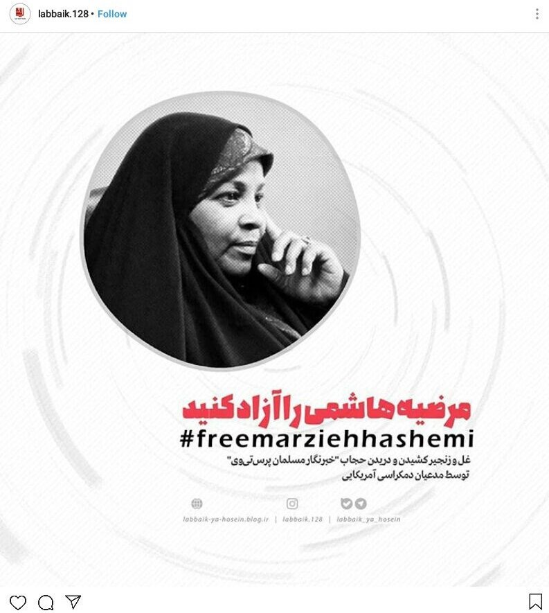 کاربران در فضای مجازی با انتشار پوسترهای مختلفی از مرضیه هاشمی با عناوینی همچون «حقوق بشر آمریکایی»، «مسلمان مکتب خمینی»، «حقوق زنان کجاست؟» و ...نسبت به دستگیری او اعتراض کرده‌اند. برخی با مقایسه وضعیت بازداشت او در امریکا و وضعیت بازداشت افرادی همچون نازنین زاغری در ایران به برخورد حکومت‌ها نسبت به مسئله حقوق زنان اشاره کرده‌اند و عده‌ای دیگر با یادآوری حادثه کربلا طی ابراز احساسات شیعیان نسبت به این موضوع نوشته‌اند:« بعد از حادثه کربلا، دیگر تحمل رنج اسارت زنی را نداریم...» همچنین تعدادی از کاربران با اعتراض به سکوت سلبریتی‌ها درباره این موضوع خطاب به آنان نوشته‌اند: «چرا لال شده‌اید؟»