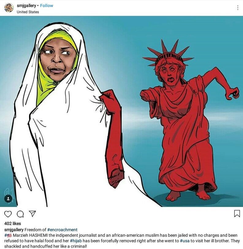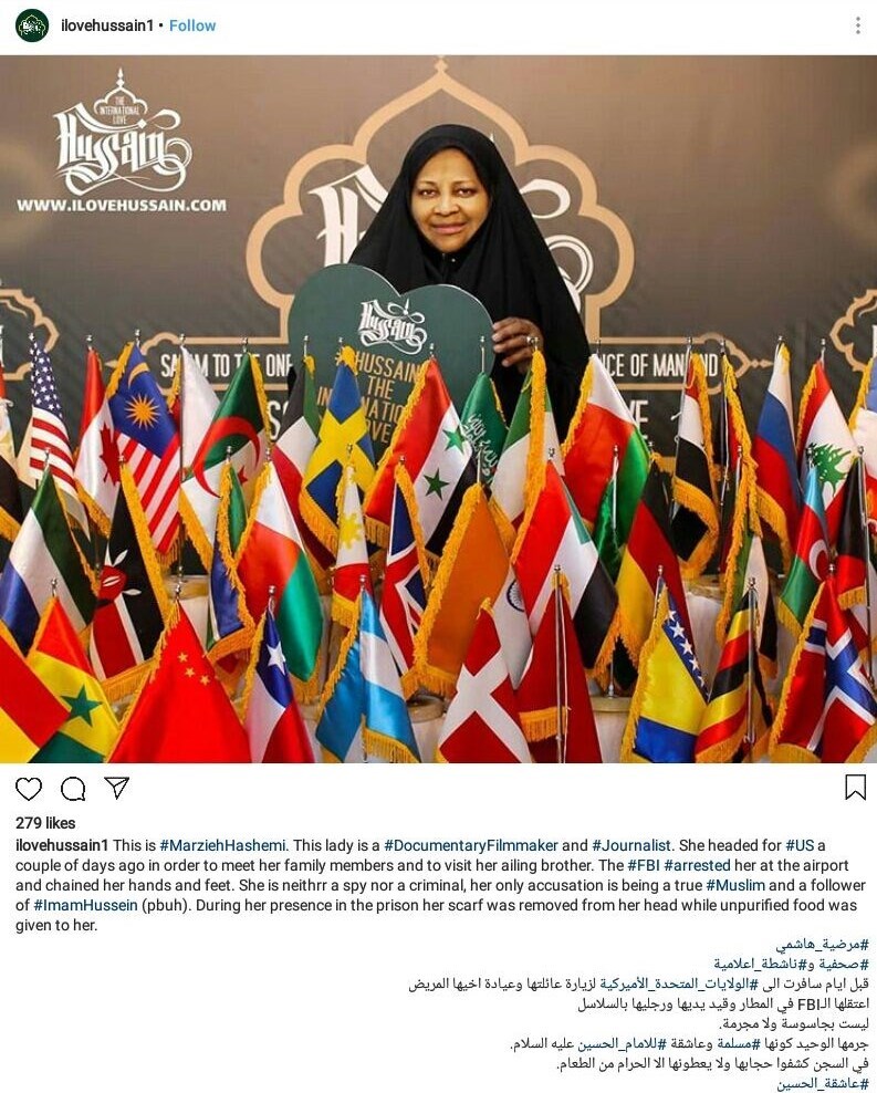 هاشمی که برای دیدار با فرزندان و بستگان و عیادت از برادر بیمار مبتلا به سرطانش به زادگاهش سفر کرده بود، هفته گذشته در فرودگاه سنت‌لوئیس لمبرت بازداشت شده و پس از ساعت‌ها بی‌خبری کامل، سرانجام در گفت‌وگوی کوتاه تلفنی با دخترش گفته است مسئولین زندان دست و پای او را با زنجیر بسته و همانند یک جانی با او رفتار کرده‌اند. این مجری آمریکایی‌الاصل مسلمان‌شده، همچنین از عدم رعایت حقوق اولیه‌اش توسط مأموران زندان خبر داده و اظهار کرده است که حجاب او علی‌رغم اعتراض جدی‌اش برداشته شده و در بدو ورود، از او بدون حجاب عکسبرداری شده است. همچنین تنها دو تی‌شرت به او داده شده که هاشمی از یکی از آنها به‌عنوان پوشش سر استفاده کرده و همچنان از داشتن پوشش کامل اسلامی محروم است. مسئولین زندان دیگر حقوق مسلم این خبرنگار بین المللی مسلمان را نیز رعایت نکرده و غذای حلال در اختیار او نگذاشته‌اند و هاشمی از این جهت نیز به‌دلیل امتناع از خوردن گوشت خوک، در شرایط نامناسبی به‌سر می‌برد.