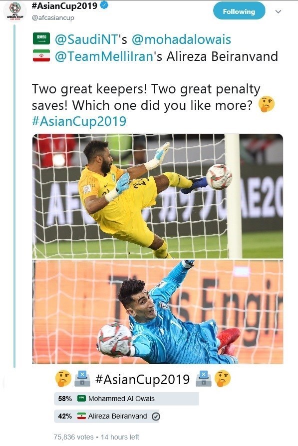 به گزارش خبرگزاری تسنیم، کنفدراسیون فوتبال آسیا (AFC) از طریق حساب کاربری رسمی مسابقات جام ملتهای آسیا 2019 در شبکه اجتماعی «توئیتر» و در یک نظرسنجی از کاربران خواست تا بهترین پنالتیگیر جام هفدهم را که رقابتی بین دو دروازهبان تیم ملی فوتبال ایران و تیم ملی عربستان است را انتخاب کنند.