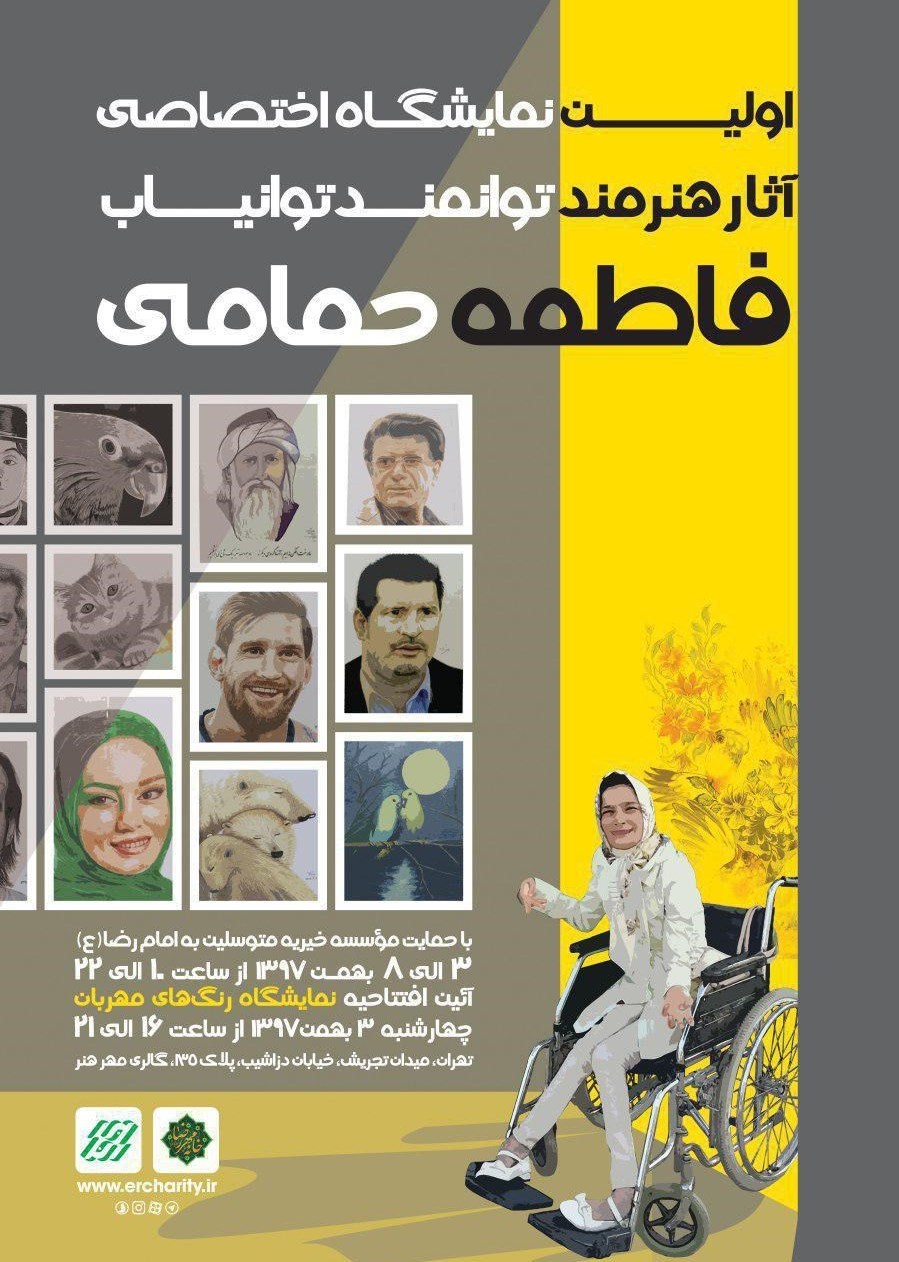 اینک یکی دیگر از معلولان ( فاطمه حمامی) بنا دارد نمایشگاهی از آثار هنری خود را برپا کند، از آثار هنری حمامی میتوان به نقاشی از چهرههای علی دایی،مسی، علی کریمی و مهران مدیری و... اشاره کرد.
