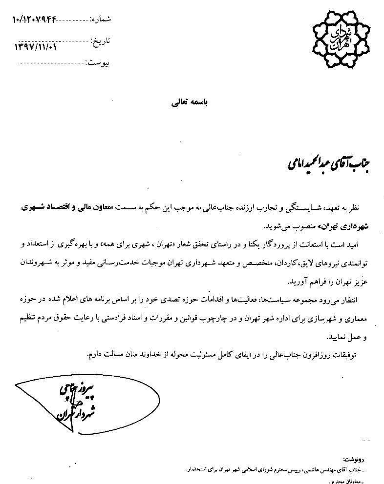 به گزارش باشگاه خبرنگاران پویا، پیروز حناچی شهردار تهران طی حکمی عبدالحمید امامی را به عنوان معاون مالی و اقتصاد شهری شهرداری تهران منصوب کرد.