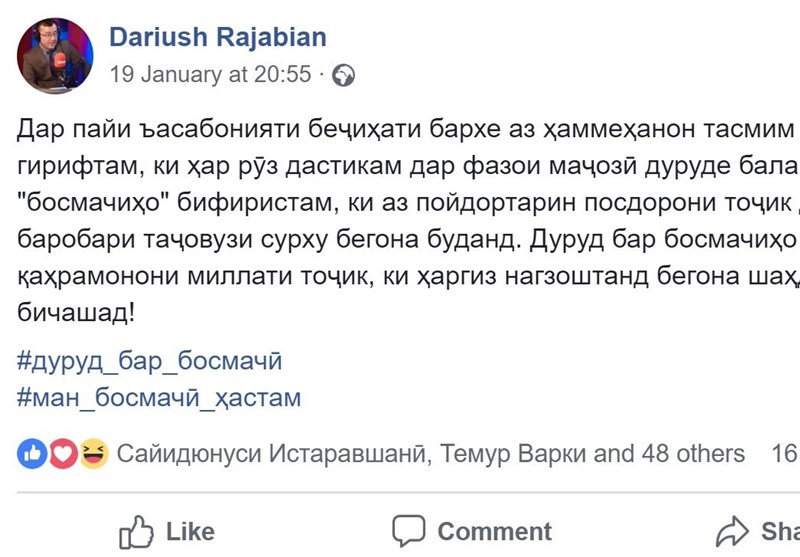 در پی اظهارات محیالدین کبیری و شمار دیگری از روشنفکران، تحلیلگران و فعالین سیاسی و اجتماعی تاجیک، با افزایش مناظرات و واکنشهای جریانهای وابسته به دولت تاجیکستان، پویشی تحت عنوان «من باسماچی هستم» (به تاجیکی: #ман_босмачӣ_ҳастам) توسط برخی چهرههای فعال تاجیک همچون داریوش رجبیان، باباجان قیومزاده و سیدیونس استروشنی به راه افتاده است. این پویش به سرعت در حال یافتن طرفداران زیادی است و گروهها، صفحات و محافل بسیاری در این باره در شبکههای اجتماعی و بهویژه فیسبوک به راه افتاده است. اظهار نظرهای مختلفی نیز در این باره صورت میگیرد.